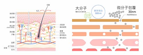 皮膚角質層約在50nm(奈米)左右,稱小分子<50nm,大分子>50nm (註一根頭髮的直徑大約是 30,000 ~ 50,000 nm)。所以成分標示「微分子」、「胜肽」表示可以順利進入皮膚深層,以醫美常見的「玻尿酸」為大分子僅能留在皮膚外部當保濕作用。注射「玻尿酸」則可淡化法令紋、皺紋、細紋、填補淚溝黑眼圈與拉提皮膚鬆弛。有效成份能否深入皮膚才是有效關鍵指標。